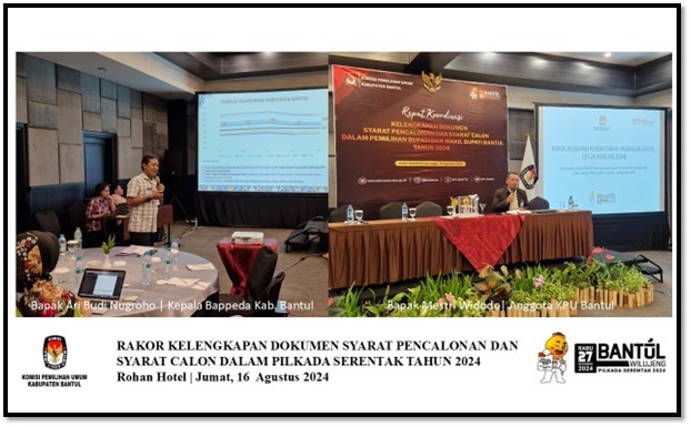 Jumat, 16 Agustus 2024 – KPU Kabupaten Bantul menyelenggarakan Rapat Koordinasi untuk menguatkan proses tahapan pencalonan dalam hal kelengkapan dokumen syarat pencalonan dan syarat calon bagi partai politik (parpol) yang memiliki kursi anggota DPRD Kabupaten Bantul Periode 2024-2029. Ada 60 peserta yang diundang dalam kegiatan rakor ini dengan dua agenda pokok, pertama menyerahkan Surat Keputusan KPU Bantul kepada Direktur RSUD Panembahan Senopati sebagai Adminitrasi Penetapan tempat pemeriksaan Kesehatan bagi calon bupati dan wakil bupati yang diusulkan oleh Parpol/gabungan parpol. Sedangkan agenda kedua, pemamparan Rencana Pembangunan Jangka Panjang Daerah (RPJPD) Bantul oleh Kepala Bappeda Bantul.