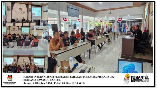 Jumat, 4 Oktober 2024, Pukul 09.00 – 10.30 WIB KPU Bantul menyelenggarakan Rapat Koordinasi Internalisasi Persiapan Tahapan Pemungutan dan Penghitungan Suara (Tungsura) Pilkada Tahun 2024 bersama Bawaslu Bantul. Hadir dalam kegiatan ini, Perwakilan Bawaslu Bantul, Ibu Dewi Nurhasanah (Kordiv Pencegahan, Partisipasi Masyarakat dan Hubungan Masyarakat) dan Ulfa Nila Sari (staff). Sedangkan peserta internal dari KPU Bantul terdiri dari Bapak Rahmat (Plh. Sekretaris); Ibu Deny, Ibu Ayu (Kasubag) dan Ibu Bikah (Jabfung) serta staff sekretariat KPU Bantul.