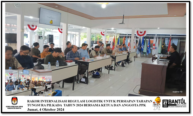 Jumat, 4 Oktober 2024, Pukul 14.00 WIB KPU Bantul menyelenggarakan Rapat Koordinasi Internalisasi Regulasi Logistik Untuk Persiapan Tahapan Pemungutan dan Penghitungan Suara (Tungsura) Pilkada Tahun 2024. Peserta kegiatan ini terdiri dari 17 Ketua dan Anggota PPK yang mengampu bidang Teknis Penyelenggaraan. Acara di pandu oleh Kadiv Teknis Penyelenggaraan KPU Bantul, Bapak Mestri Widodo.