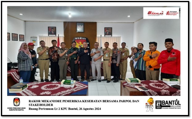 Senin, 26 Agustus 2024 – Pukul 13.30 WIB KPU Kabupaten Bantul melakukan rapat koordinasi mekanisme pemeriksaan kesehatan Bersama 18 partai politik hasil pemilu 2024 dan stakeholder terkait. Rakor dipandu oleh Kadiv Teknis Penyelenggaraan KPU Bantul, Bapak Mestri Widodo memberikan pengatar bahwa kegiatan ini untuk memperjelas gambaran proses pemeriksaan kesehatan di RSUD Panembahan Senopati yang telah ditetapkan oleh KPU Bantul berdasarkan SK No 451 Tahun 2024. Tujuan pemeriksaan kesehatan untuk menilai status kesehatan dan identifikasi kemungkinan adanya ketidakmampuan secara jasmani dan Rohani yang mengganggu kemampuan dalam menjalankan tugas dan kewajibannya sebagai Bupati dan Wakil Bupati bila terpilih.