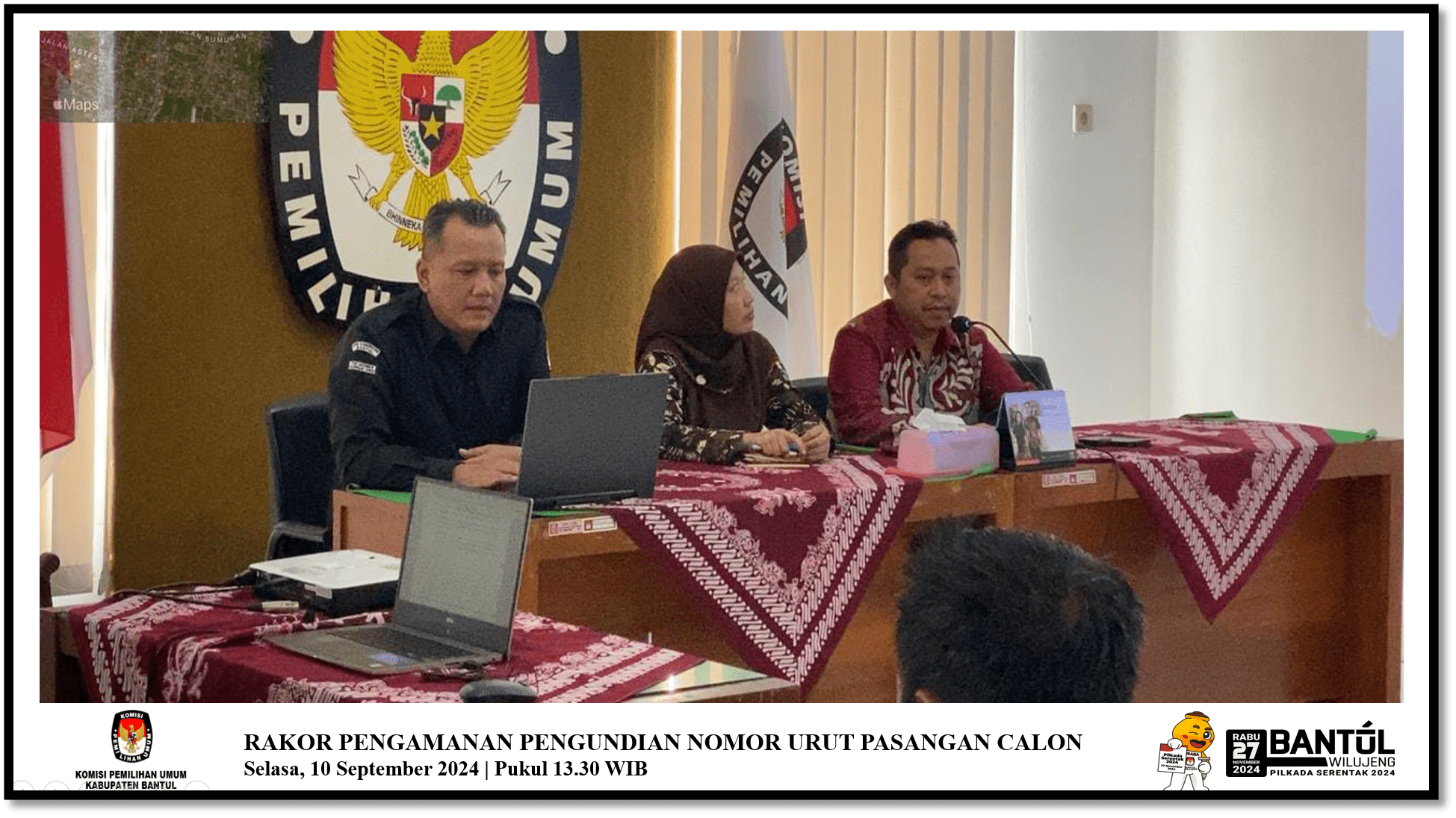 Selasa, 10 September 2024, KPU Bantul mengadakan kegiatan koordinasi untuk pengamanan tahapan pencalonan pilkada 2024 untuk kegiatan pengundian nomor urut paslon. Rakor pengamanan ini mengundang pihak terkait antara lian Polres Bantul, Kodim 0729, Badan Kesbangpol, Dinas Perhubungan, Satpol PP, Desk Pilkada Tapem, dan petugas penghubung paslon serta Bawaslu Bantul. Acara di buka oleh Ketua KPU Bantul, Bapak Joko Santosa yang menyampaikan alur tahapan pencalonan yang titik puncaknya adalah penetapan pasangan calon pada tanggal 22 September 2024.