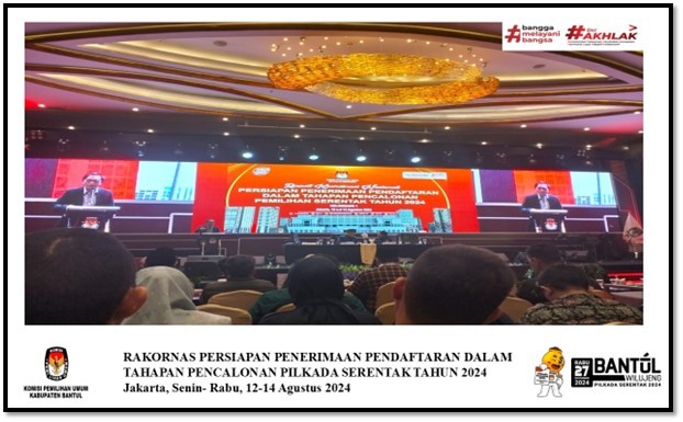 Rabu, 14 Agustus 2024 – KPU Kabupaten Bantul mengikuti secara penuh agenda Rapat Koordinasi Nasional (RAKORNAS) Persiapan Penerimaan pendaftaran dalam Tahapan pencalonan Pilkada Serentak Tahun 2024 gelombang satu yang dilaksanakan oleh KPU RI selama 3 hari mulai tanggal 12 Agustus dan berakhir di hari Rabu, 14 Agustus di Jakarta. Perwakilan dari KPU Bantul yang hadir terdiri dari Bapak Joko Santosa, Bapak Mestri Widodo, Bapak Dani dan Bapak Diwangkara yang selama proses rakornas mendapatkan fasilitasi dari KPU RI di Hotel For You (HORU) Mangga dua Jakarta Utara.