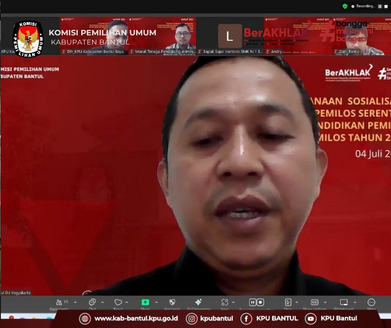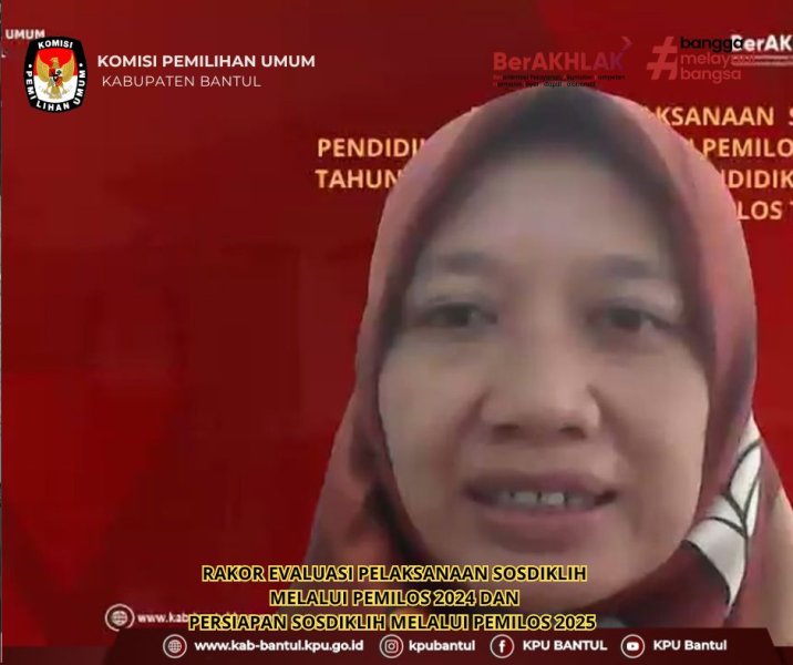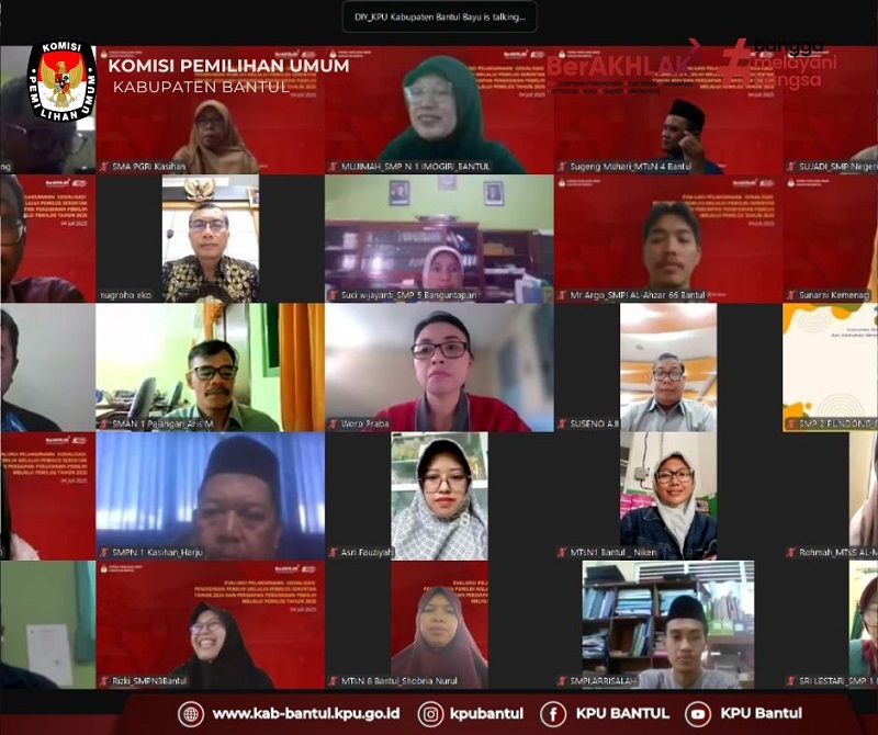 Jumat (4/7) KPU Kabupaten Bantul mengadakan rapat evaluasi sosialisasi pendidikan pemilih (Sosdiklih) melalui pemilos serentak Tahun 2024 dan persiapan sosdiklih melalui pemilos Tahun 2025 secara daring melalui zoom meeting. Mengundang dinas/instansi terkait yakni Disdikpora, Diskominfo, Bakesbangpol, Kemenag Bantul, Balai Dikmen Bantul, Kepala SMA/SMK/MA dan Kepala SMP/MTs serta Forum Komunikasi Pengurus OSIS (FKPO).