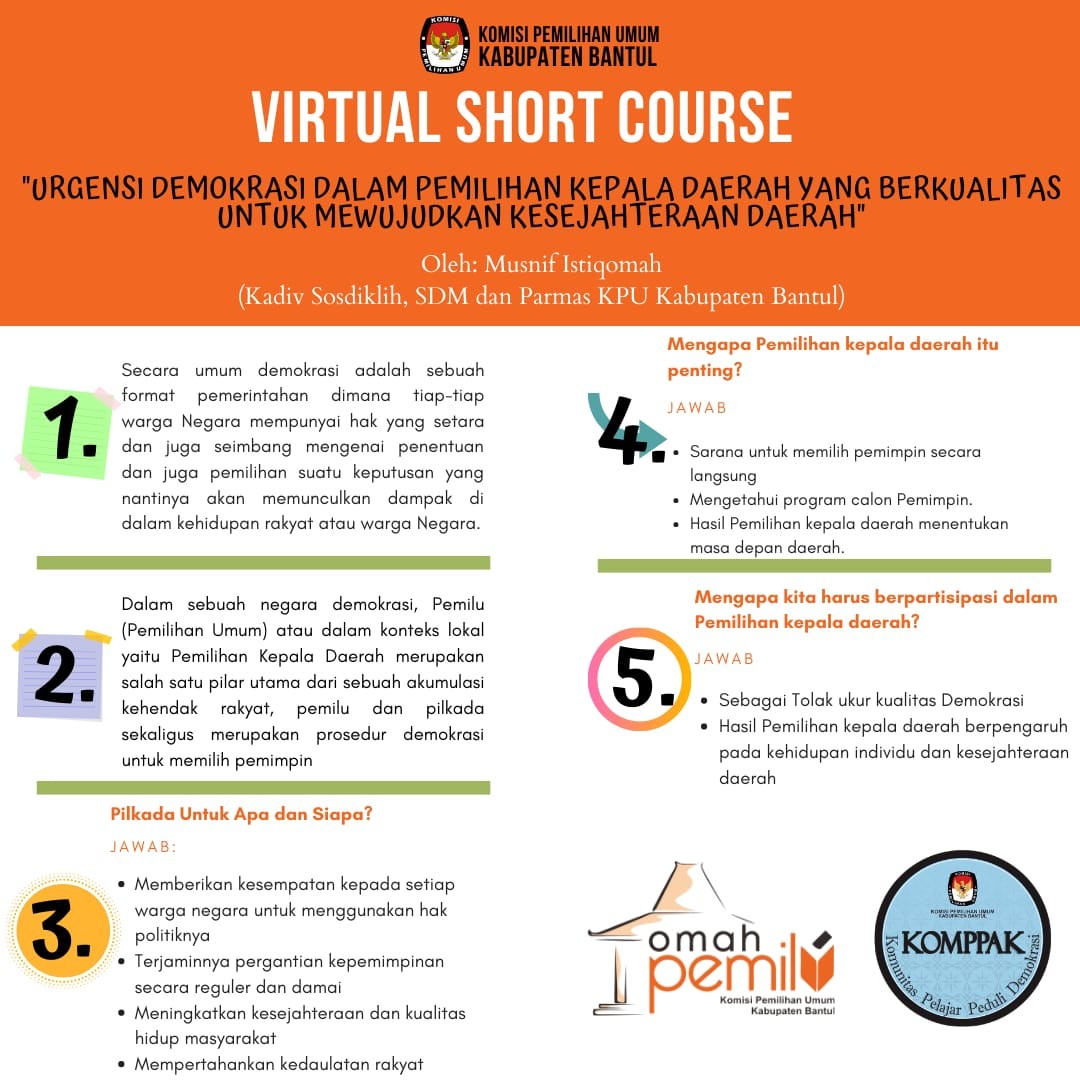 Meskipun ditengah pendemi Covid 19 serta dalam masa penundaan tahapan Pemilihan Bupati dan Wakil Bupati, KPU Bantul tetap melaksanakan pendidikan pemilih melalui media daring. Kegiatan virtual short course pendidikan pemilih pemula dilakukan selama 4 (empat) kali dengan diikuti oleh sekitar 40 orang Ketua OSIS SMA/SMK/MA se Kabupaten Bantul yang tergabung dalam Komunitas Pelajar Peduli Demokrasi (KOMPPAK). Ketua Divisi Sosialisasi, Pendidikan Pemilih, Partisipasi Masyarakat dan SDM KPU Bantul, Musnif Istiqomah menjelaskan bahwa Pendidikan pemilih melalui virtual short course ini merupakan adaptasi KPU Bantul sebagai penyelenggara Pemilu/Pemilihan terhadap situasi pendemi Covid 19 dalam hal menyongsong Pemilihan Bupati dan Wakil Bupati Bantul yang saat ini masih dalam masa penundaan. Lebih lanjut disampaikan bahwa dalam virtual short course ini disampaikan tema-tema yang berkaitan dengan demokrasi dan pemilihan kepala daerah diantaranya urgensi demokrasi dalam pemilihan kepala daerah, tahapan-tahapan pemilihan kepala daerah serta kontribusi pemilih pemula dalam pemilihan kepala daerah. KPU Bantul juga melibatkan Pusat Studi Hukum dan Konstitusi, UII sebagai narasumber kegiatan diskusi dengan media daring ini.
