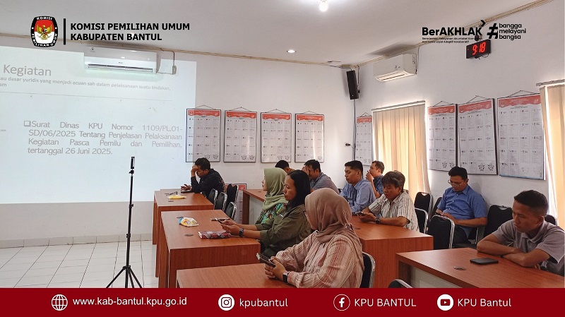Kamis, 10 Juli 2025 (09.00-10.00 WIB) - Divisi Teknis Penyelenggaraan KPU Bantul mengadakan Sosialisasi Internal Kegiatan Pendokumentasian Tahapan Teknis Pemilu Dan Pemilihan Tahun 2024. Penyelenggaraan kegiatan berdasarkan Surat Dinas KPU Nomor 1109/PL.01-SD/06/2025 Tentang Penjelasan Pelaksanaan Kegiatan Pasca Pemilu dan Pemilihan. Mestri Widodo memulai kegiatan dengan menyampaikan arahan Anggota KPU RI, Idham Holik “bahwa kegiatan reviu, pendokumentasian dan kajian tahapan teknis pemilu dan pemilihan penting dilakukan dalam rangka menjalankan prinsip profesional sebagai penyelenggara serta mempersiapkan tahapan pemilu dan pemilihan ke depan yang lebih baik”. Kegiatan yang diikuti oleh staf sekretariat KPU Bantul merupakan bagian dari penguatan internal untuk memahami kebijakan kegiatan yang dilakukan oleh KPU Bantul pada semester 2 Tahun 2025.