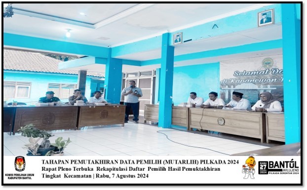 Rabu, 7 Agustus 2024 – Penyelenggaran Tahapan Pilkada Serentak Tahun 2024 terus beproses menuju Rabu, 27 November 2024 yaitu Hari Pemungutan dan Penghitungan Suara (tungsura) di TPS. Bila dihitung dari tanggal 7 Agustus maka kurang 111 hari menuju HARI TUNGSURA. Sebelum menuju Tahapan tungsura, KPU Kabupaten Bantul di Bulan Agustus 2024 sedang melaksanakan tahapan pemuktakhiran data pemilih (mutarlih) yang seiring sejalan dengan tahapan pencalonan pilkada 2024.