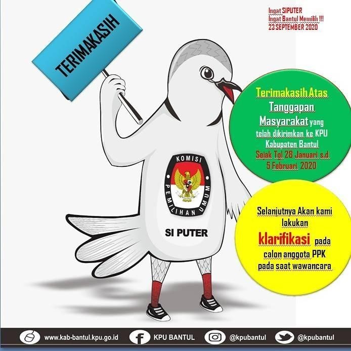 Terima kasih kepada masyarakat Bantul yang telah memberikan tanggapan atas calon anggota Panitia Pemilihan Kecamatan Pemilihan 2020 Kabupaten Bantul.