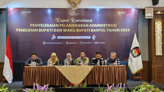 Ketua KPU Kabupaten Bantul, Joko Santosa membuka Rapat Koordinasi Penyelesaian Pelanggaran Administrasi Pemilihan Bupati dan Wakil Bupati Bantul Tahun 2024 yang diselenggarakan pada Sabtu (19/10/2024) di Hotel Grand Rohan-Yogya. Peserta yang mengikuti kegaitan ini adalah Ketua PPK, Anggota PPK bidang Hukum dan Ketua PPS se-Kabupaten Bantul. Dalam sambutan pembukaannya, Joko mengajak PPK dan PPS agar berkomitmen dan fokus di 38 hari terakhir demi mensukseskan pelaksanaan pemilihan serentak tanggal 27 November mendatang, Diingatkan juga untuk menjaga komunikasi, kooordinasi, dan berhati-hati dalam bermedia sosial maupun saat mengikuti kegiatan organsisasi. Narasumber acara ini adalah Ketua Divisi Hukum dan Pengawasan KPU DIY Ibah Muthiah yang memaparkan materi terkait PKPU Nomor 15 Tahun 2024 tentang Tata Cara Pelanggaran Administrasi Pemilihan. Ketua Divisi Hukum KPU Bantul, Imron Hidayatulloh menambahkan bahwa pelanggaran administrasi bisa berdampak pada Pemilihan Suara Ulang (PSU) dan Pemilihan Suara Lanjutan (PSL). Penyampaian materi selanjutnya oleh Anggota Bawaslu Kabupaten Bantul Ari Sukowati terkait alur penertiban APK dalam Pemilihan Bupati dan Wakil Bupati Bantul Tahun 2024. Selama masa kampanye masing-masing kecamatan akan dilakukan 2 (dua) kali penertiban APK, yaitu akhir bulan Oktober dan minggu ketiga bulan November. Personil pembersihan APK terdiri dari Kodim 0729 Bantul, Polres Bantul, Kejaksaan Negeri Bantul, Satpol PP Bantul, Dinas Perhubungan Bantul, Dinas lingkungan Hidup Bantul, Bawaslu Bantul dan KPU Bantul bersama PPK dan PPS.