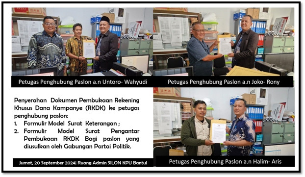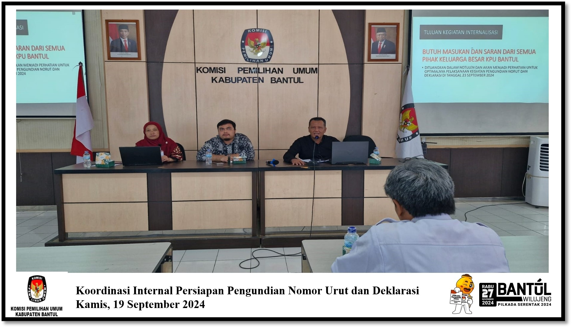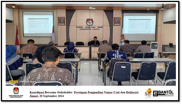Minggu, 22 September 2024, 16.00 WIB KPU Bantul menyelenggarakan koordinasi untuk mempersiapkan tahapan kampanye, khususnya kegiatan dana kampanye dalam pilkada 2024. Kegiatan Dana Kampanye diampu oleh Kadiv Teknis Penyelenggaraan KPU Bantul (Mestri Widodo) dengan berpedoman pada PKPU Nomor 14 Tahun 2024 tentang Dana Kampanye Peserta Pemilihan Gubenur dan Wakil Gubenur, Bupati dan Wakil Bupati, serta Walikota dan Wakil Walikota yang ditetapkan KPU RI tertanggal 20 September 2024. Peserta yang hadir dalam rakor terdiri dari Petugas penghubung (LO) Paslon Halim-Aris (Syafiq, Muslim dan Imron), LO Paslon Joko-Rony (adiep dan Arif), LO Paslon Untoro-Wahyudi (Fitra dan Heri) dan Bawaslu Bantul (Ari Sukowati). Materi pembahasan dalam rakor ada tujuh hal, yaitu Perkembangan Pembukaan RKDK, Pembatasan Pengeluaran Dana Kampanye, Persiapan Penyampaian LADK, Layanan helpdesk Dana Kampanye, Persetujuan (approval) Naskah visi misi dan foto paslon untuk ditampilkan dalm SK Penetapan Nomor urut dan persiapan akhir pengundian nomor urut di tanggal 23 September 2024. Mestri Widodo memandu proses koordinasi dengan hasil pembahasan tertuang dalam notula (catatan), dan poin poinnya antara lain : Pembukaan RKDK berdasarkan PKPU No 14 Tahun 2024 tentang Dana Kampanye: Pasal 12 : Pembukaan RKDK dimulai sejak pendaftaran Pasangan Calon sampai dengan 1 (satu) Hari sebelum masa Kampanye dimulai. (24 September 2024). Pembatasan Pengeluaran Dana Kampanye , LO Paslon sepakat denagn Opsi pembatasan di angka Rp. 44 Miliar; Persiapan Penyampaian LADK: Berdasarkan PKPU No 14 Tahun 2024 tentang Dana Kampanye di Pasal 26 : Periode Pembukuan LADK dimulai sejak pembukaan RKDK sampai dengan 1 (satu) Hari sebelum waktu penyampaian LADK; Penyampaian LADK pada tanggal 24 September 2024 LO memberikan approval foto paslon dan naskah visi misi; Pukul 17.17 WIB Rakor diakhiri oleh Kadiv Teknis Penyelenggaraan dengan menegaskan Bahwa KPU Bantul membuka Layanan Helpdesk untuk kegiatan Dana Kampanye, mulai dari pembukaan RKDK dan pelaporan dana kampanye sesuai dengan program dan jadwal kegiatan tahapan Dana Kampanye Pilkada 2024 dalam lampiran PKPU Nomor 14 Tahun 2024. (MW)
