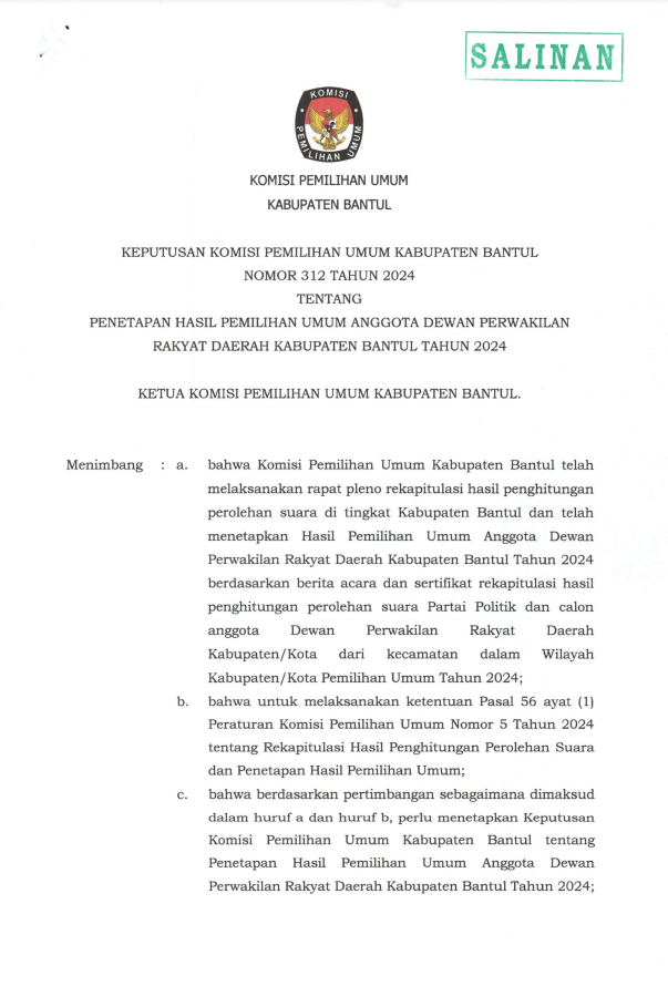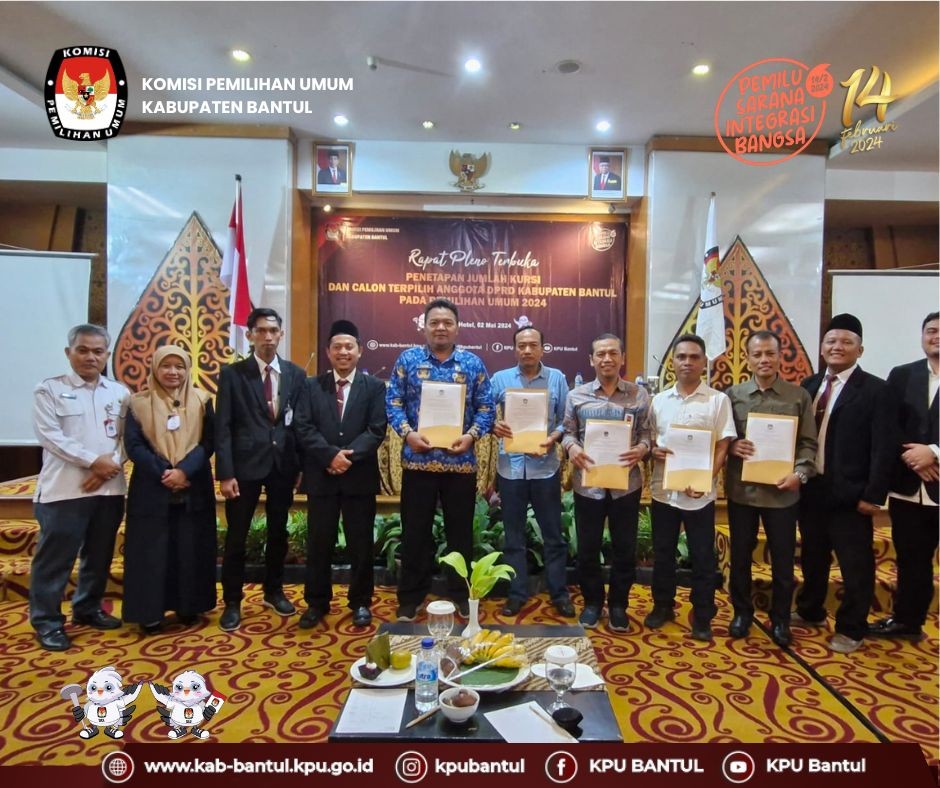 amis (2/5) KPU Kabupaten Bantul mengadakan Rapat Pleno Terbuka Penetapan Jumlah Kursi dan Calon Terpilih Calon Anggota DPRD Kabupaten Bantul pada Pemilu Tahun 2024 di Hotel Ros In Yogyakarta. Acara yang mengundang Forkopimda, Ketua Bawaslu, Stakeholder terkait, Partai Politik dan Media ini disiarkan secara langsung melalui streaming Youtube KPU Bantul. Dalam sambutannya, Ketua KPU Kabupaten Bantul menyampaikan bahwa penetapan ini terlaksana setelah ada surat dari Mahkamah Konstitusi yang menyatakan KPU Kabupaten Bantul tidak ada gugatan pada Pemilihan Legislatif. Ketua dan anggota KPU Kabupaten Bantul secara bergantian membacakan surat keputusan KPU Bantul Nomor 318 Tahun 2024 tentang Penetapan Perolehan Kursi Partai Politik Peserta Pemilu Anggota DPRD Kabupaten Bantul pada Pemilu Tahun 2024. Disebutkan bahwa dalam 6 daerah pemilihan (Dapil) PKB mendapat 7 kursi, Gerindra 6 kursi, PDIP 12 kursi, Golkar 6 kursi, PKS 6 kursi, PAN 2 kursi, Demokrat 3 kursi, PPP 2 kursi dan Ummat 1 kursi. Selain itu juga membacakan SK Nomor 319 Tahun 2024 tentang Penetapan Calon Terpilih Anggota DPRD Kabupaten Bantul dalam Pemilu 2024. Untuk Dapil 1 diisi oleh Subhan Nawwawi (PKB) Theodora Ratna Widiastuti (PDIP), Yuliana Tumonglo (Demokrat), Pramu Diananto Indratriatmo (PDIP), Suwandi, (Ummat), Herdimas Indranugraha Putra (Golkar), Agung Laksmono (PKS) dan Aurely Putri Anjani (Gerindra). Dapil 2 terdiri dari Mahmudin (PKB), Nur Yuni Astuti (PDIP), Titis Ajeng Ganis Mareti(Gerindra), Salsha Aurellia Daninsky (PAN), Edy Prabowo (Demokrat), Ahmad Agus Sofwan (PKS), Endro Sulastomo (PDIP) dan Teguh Santoso (Golkar). Dapil 3 diisi oleh Hanung Raharjo (PDIP), Rony Wijaya Indra Gunawan (Demokrat), Suratman (PDIP), Dhony Kristanto (Gerindra), Yasmuri (PKB), Nur Kholis Majid (PKS) dan Sri Rahayu Astuti (Golkar). Dapil 4 diisi oleh Dwi Kristiantoro (PDIP), Ani Widayani (PDIP), Paidi (Golkar), Saryanto (Gerindra), Herry Fahamsyah (PAN), Muhammad Dhavid (PKS), Suradal dan Sukardiyono (PKB). Dapil 5 terdiri dari Dody Purnomo Jati (PDIP), Heru Sudibyo (Golkar), Sugeng Sudaryanta (PDIP), Muhammad Agusalim (PKB), Sapta Sarosa (PPP), Jumirin (Gerindra) dan Nur Huda Waskitha Yoga (PKS). Sedangkan Dapil 6 diisi oleh Jumakir (PPP), Johan Munandar (PKB), Datin Wisnu Pranyoto (Gerindra), Sapto Priyono (Golkar), Purwana (PDIP), Agustinus Sulistyodjati (PDIP) dan Arif Haryanto (PKS). Semua yang hadir mendapatkan 2 (dua) Salinan SK tersebut.