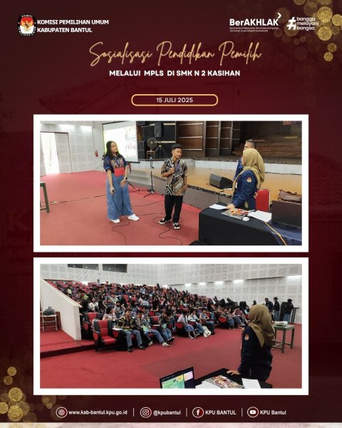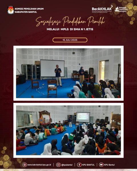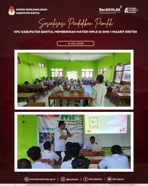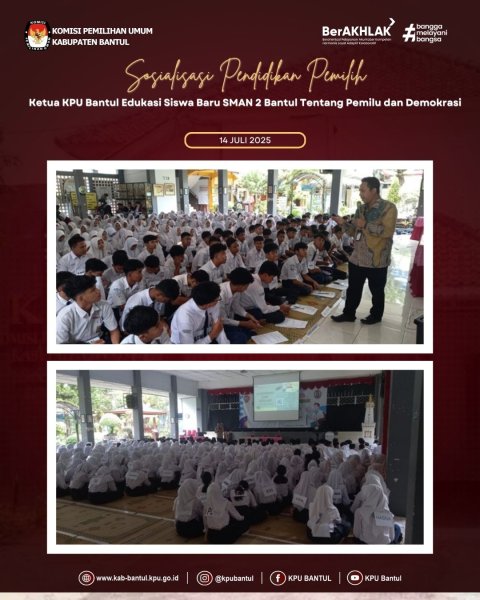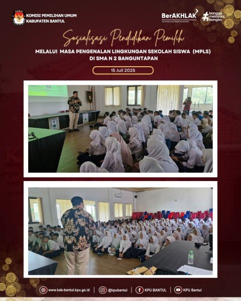 Selasa ( 15/7), KPU Kabupaten Bantul mengisi kegiatan Masa Pengenalan Lingkungan Sekolah (MPLS) di SMAN 2 Banguntapan yang diikuti oleh 252 siswa dari 7 rombel.
