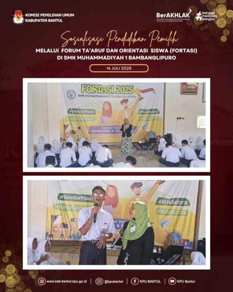Kadiv Rendatin KPU kabupaten Bantul, Arya Syailendra, menyampaikan materi tentang makna dari demokrasi, contoh pelaksanaannya di lingkungan masyarakat, sekolah dan negara, serta siapa saja yang mempunyai hak pilih dalam Pemilihan Umum (Pemilu) maupun Pemilihan Kepala Daerah (Pilkada). Disela-sela penyampaian materi dilakukan pembagian doorprice bagi siswa yang bisa menjawab pertanyaan dengan benar. Seperti siapa 3 calon presiden dalam pemilu 2024, apa kepanjangan dari TPS dan siapa nama bupati terpilih Kabupaten Bantul dalam pilkada 2024. Sebagai penutup, Arya Syailendra berpesan untuk para siswa sebagai pemilih pemula dalam pemilu yang akan datang agar menjadi pemilih yang cerdas dan bijak dalam menerima informasi kampanye dalam pemilu yang akan datang.