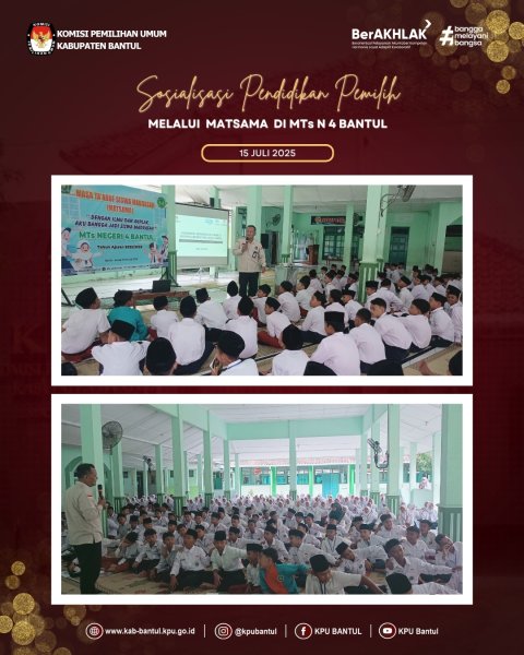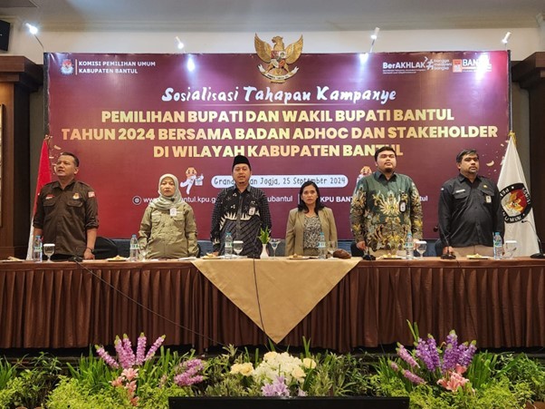 Rabu, (25/9) KPU Kabupaten Bantul melakukan Sosialisasi Tahapan Kampanye Pemilihan Bupati dan Wakil Bupati Bantul Tahun 2024 bersama badan Ad Hoc dan Stakeholder di Wilayah Kabupaten Bantul di Hotel Grand Rohan Jogja. Hadir dalam kegiatan ini Ketua Divisi Sosialisasi, Pendidikan Pemilih, Partisipasi Masyarakat, dan SDM KPU DIY, Polres Bantul, Kodim 0729, Asisten 1 Setda Kabupaten Bantul, Bawaslu Bantul, Bakesbangpol Bantul, Satuan Pol. PP Bantul, Dinas Perhubungan Bantul, Kepala Bagian Tata Pemerintahan Setda Bantul, Panewu Se-Kabupaten Bantul, Lurah se-Kabupaten Bantul, Organisasi Masyarakat dan Organisasi Disabilitas di Kabupaten serta PPK dan PPS yang membidangi Sosdiklih Parmas se-Kabupaten Bantul.