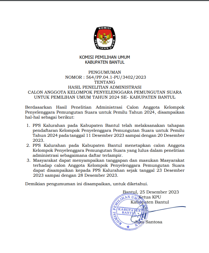 KPU Kabupaten bantul menerbitkan pengumuman no 537/PP.04.01-Pu/3402/2024 tentang Seleksi Calon Anggota KPPS untuk Pemilu Tahun 2024.