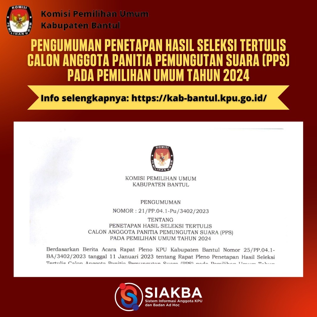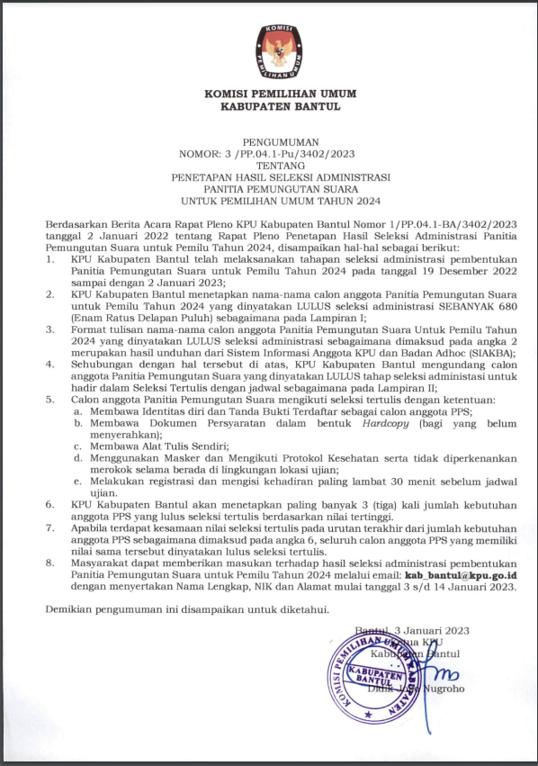 Rabu (04/01) KPU Bantul melantik sebanyak 85 anggota Panitia Pemilihan Kecamatan (PPK) untuk Pemilu 2024. Pelantikan ditandai dengan pengucapan sumpah janji yang dipandu langsung oleh Ketua Ketua KPU Bantul, Didik Joko Nugroho. Turut menyaksikan pelantikan diantaranya Ketua KPU DIY, Bupati Bantul beserta jajaran Forkompimda serta panewu dari 17 kapanewon di Bantul. Ketua KPU Bantul, Didik Joko Nugroho menyampaikan bahwa PPK adalah bagian dari penyelenggara pemilu oleh karena itu para anggota PPK harus menaati asas-asas penyelenggara pemilu dalam hal bersikap dan bertindak. PPK harus memahami dan segera menyesuaikan dengan tahapan Pemilu yang saat ini berjalan antara lain pembentukan Panitia Pemungutan Suara (PPS) untuk tingkat kalurahan serta verifikasi administrasi dan faktual pencalonan perseorangan DPD. Lebih lanjut Didik menambahkan bahwa dalam menjalankan tahapan pemilu di kapanewon PPK tidak dapat berjalan sendiri, oleh karena itu PPK harus secara intens melakukan koordinasi dengan Forum komunikasi pimpinan kapanewon serta dengan pengawas pemilu kecamatan (panwascam). Selain itu PPK juga harus membangun kolaborasi dengan organisasi kemasyarakatan, organisasi keagamaaan dan para tokoh masyarakat dalam kerangka kesuksesan tahapan Pemilu 2024. Mengantisipasi potensi permasalahan yang muncul dalam setiap tahapan, Didik meminta kepada jajaran PPK untuk melakukan mitigasi resiko disetiap tahapan. Beberapa tahapan yang penting untuk dilakukan mitigasi resiko antara lain tahapan pemutakhiran data pemilih, tahapan kampanye, tahapan pengelolaan logistik, tahapan pemungutan dan penghitungan suara serta tahapan rekapitulasi hasil penghitungan suara.