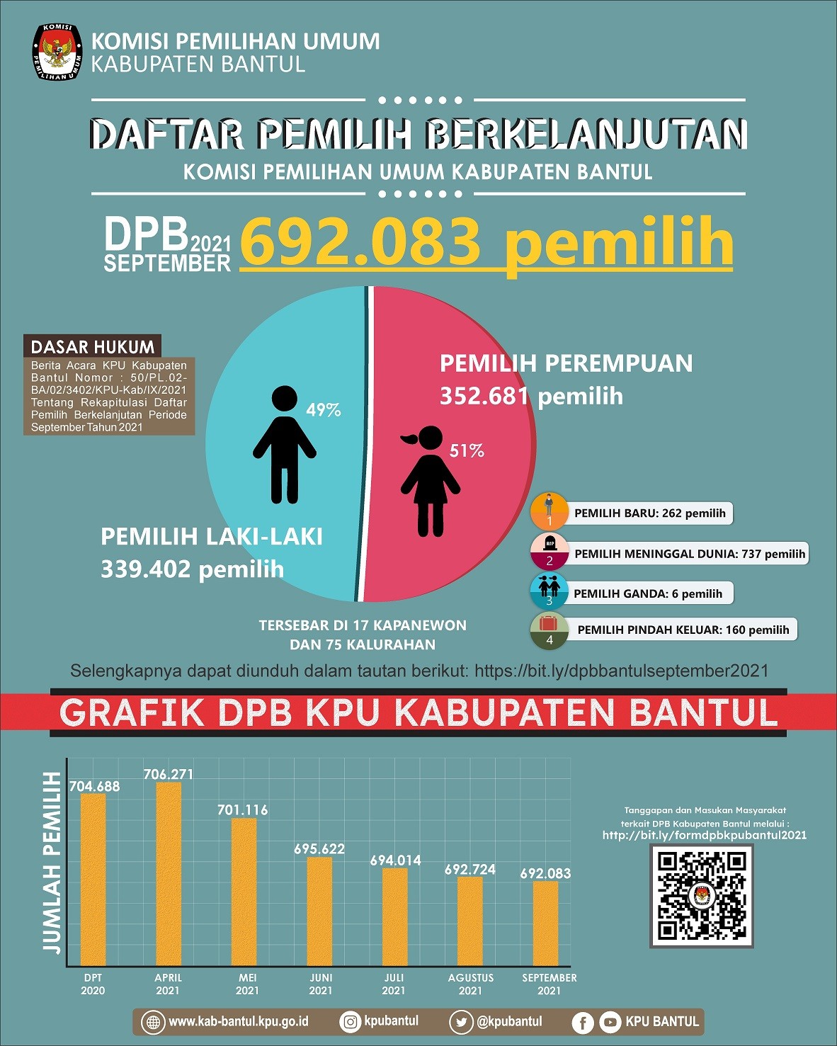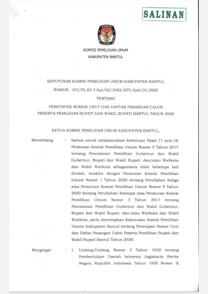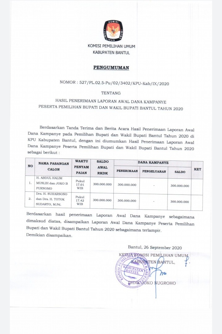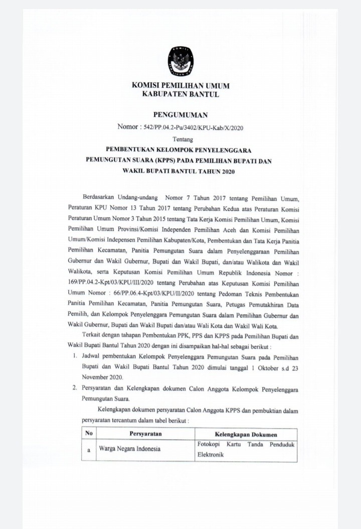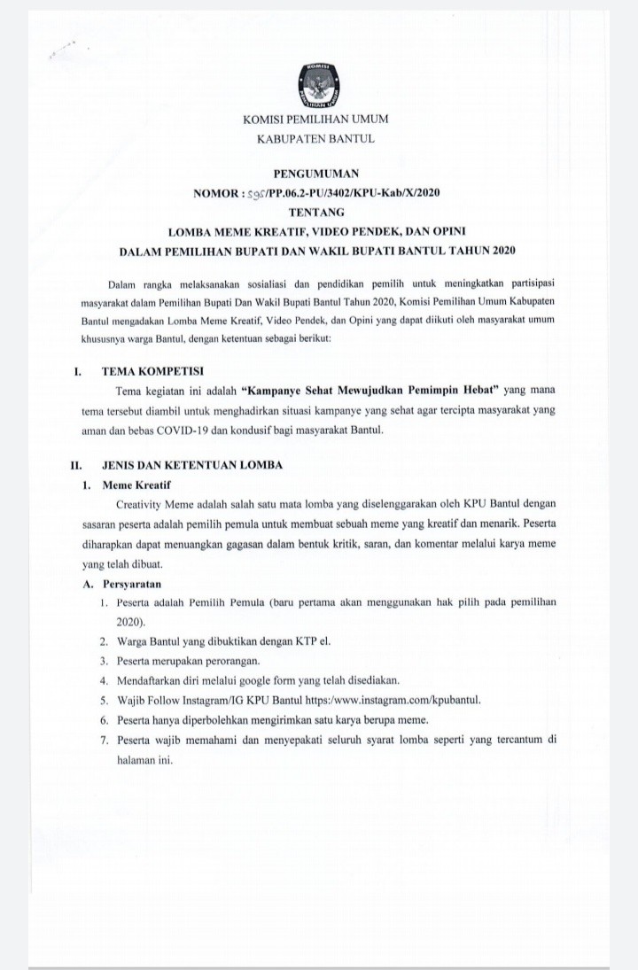 Komisi Pemilihan Umum Kabupaten Bantul mengadakan lomba Meme Kreatif, Video Pendek dan Opini yang dapat diikuti oleh masyarakat umum khususnya warga Bantul. Hal ini diadakan dalam rangka melaksanakan sosialisasi dan pendidikan pemilih untuk meningkatkan partisipasi masyarakat dalam pemilihan Bupati dan Wakil Bupati Bantul Tahun 2020. Untuk lebih lengkapnya, pengumuman dapat dilihat di sini