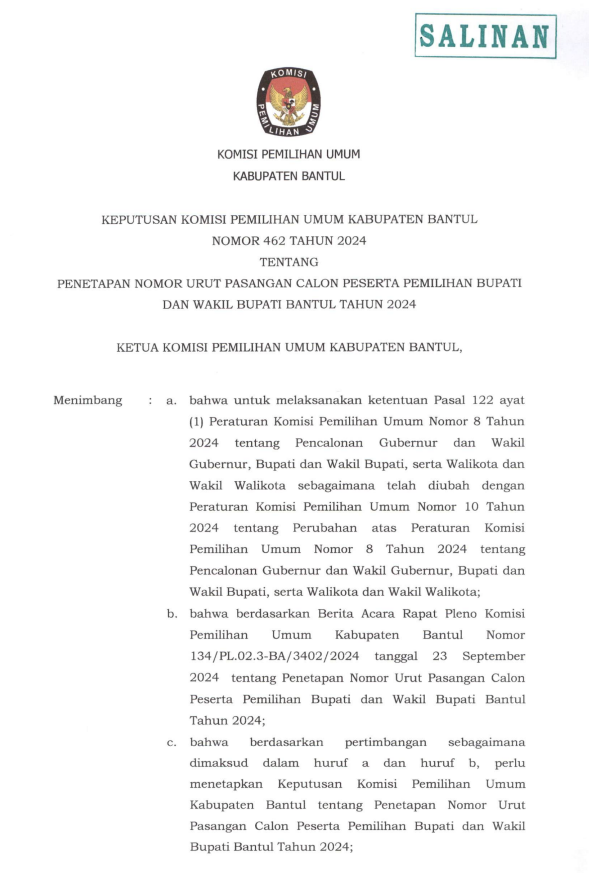 KEPUTUSAN KPU KABUPATEN BANTUL NOMOR 462 TAHUN 2024 TENTANG PENETAPAN NOMOR URUT PASANGAN CALON PESERTA PEMILIHAN BUPATI DAN WAKIL BUPATI BANTUL TAHUN 2024