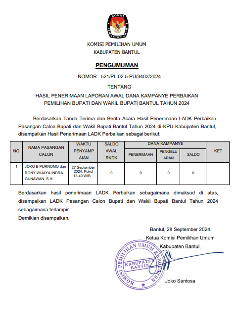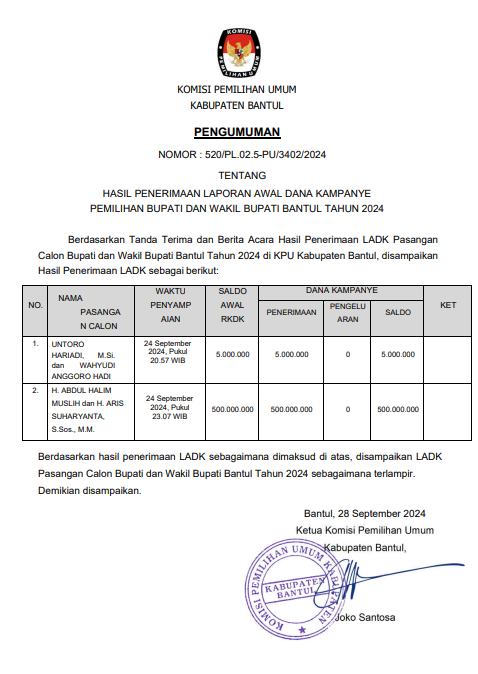 PENGUMUMAN KPU KABUPATEN BANTUL NOMOR : 521/PL.02.5-PU/3402/2024 TENTANG HASIL PENERIMAAN LAPORAN AWAL DANA KAMPANYE PERBAIKAN PEMILIHAN BUPATI DAN WAKIL BUPATI BANTUL TAHUN 2024