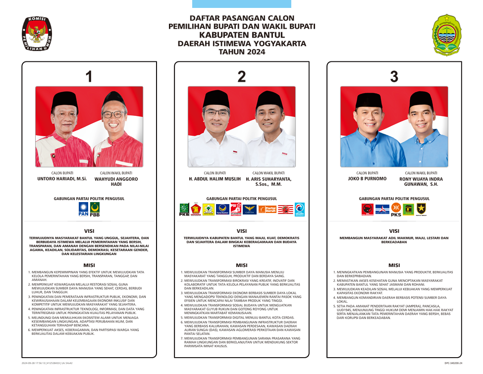 KPU Kabupaten Bantul menerbitkan pengumuman nomor 549/PL.02.2-Pu/3402/2024 tentang Daftar Pasangan Calon Bupati dan Wakil Bupati Bantul dalam pemilihan serentak Tahun 2024.