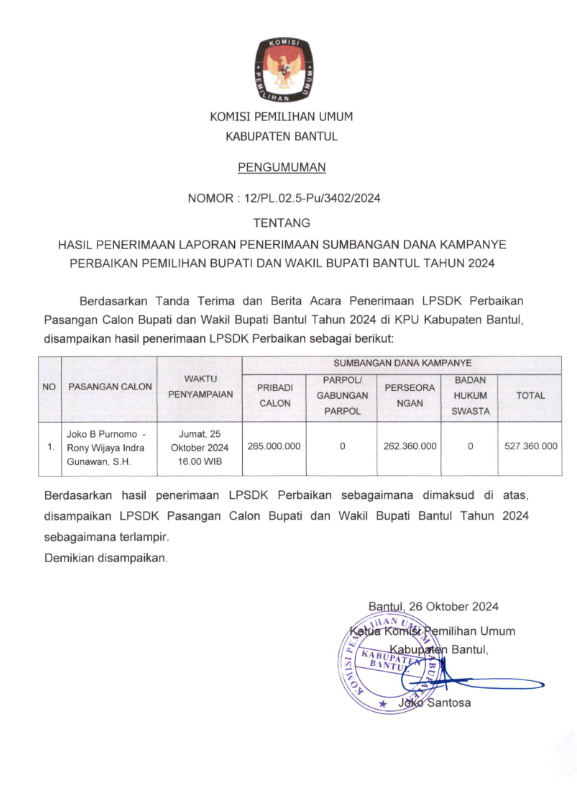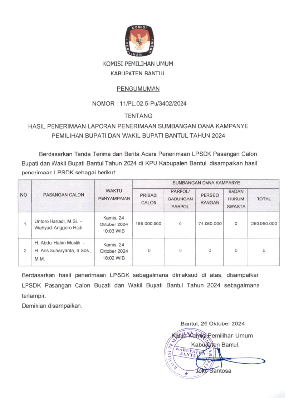 BERIKUT PENGUMUMAN KPU KABUPATEN BANTUL NOMOR 11/PL.02.5-Pu/3402/2024 TENTANG HASIL PENERIMAAN LAPORAN PENERIMAAN SUMBANGAN DANA KAMPANYE PEMILIHAN BUPATI DAN WAKIL BUPATI BANTUL TAHUN 2024
