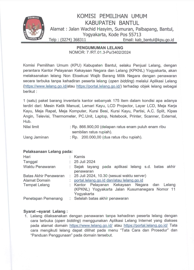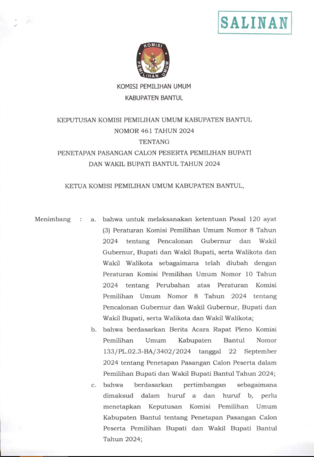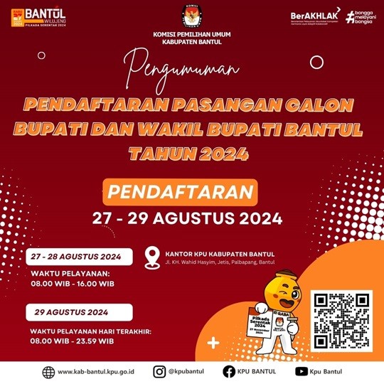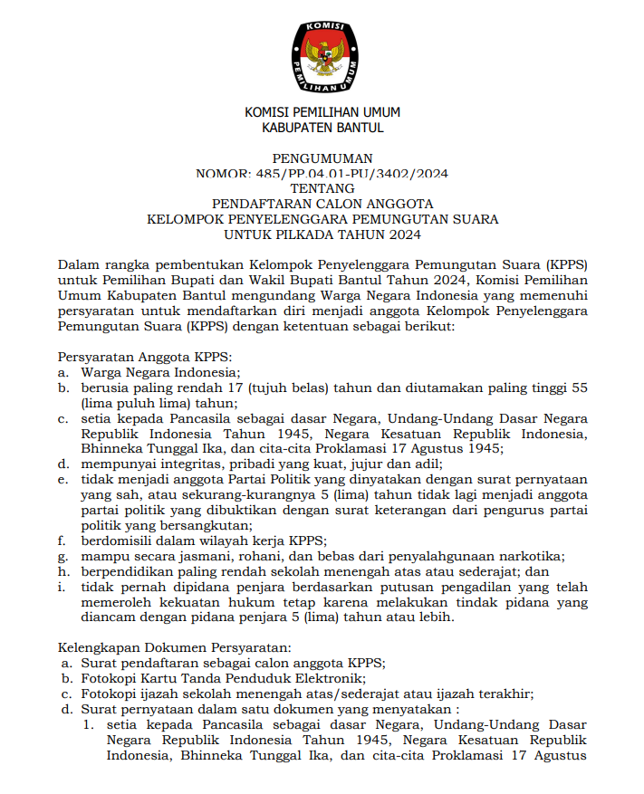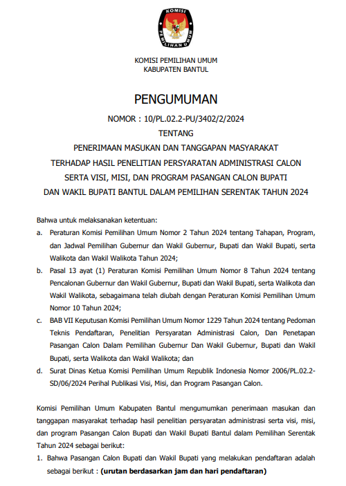 PENGUMUMAN KPU KABUPATEN BANTUL NOMOR : 10/PL.02.2-PU/3402/2/2024 TENTANG PENERIMAAN MASUKAN DAN TANGGAPAN MASYARAKAT TERHADAP HASIL PENELITIAN PERSYARATAN ADMINISTRASI CALON SERTA VISI, MISI, DAN PROGRAM PASANGAN CALON BUPATI DAN WAKIL BUPATI BANTUL DALAM PEMILIHAN SERENTAK TAHUN 2024