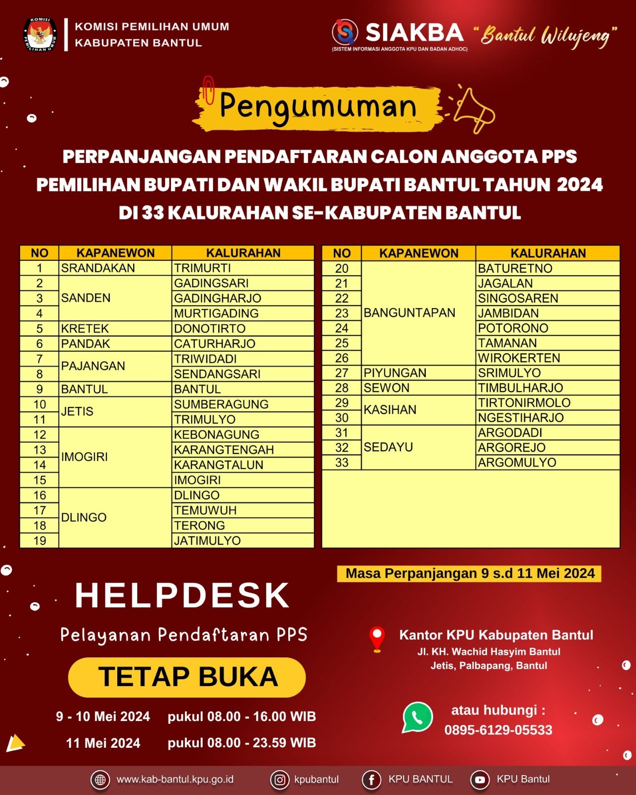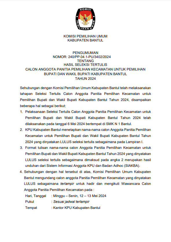 Pendaftaran dan Penelitian administrasi calon anggota PPS untuk Pemilihan Bupati dan Wakil Bupati Bantul Tahun 2024 telah dilaksanakan pada tanggal 3 - 12 Mei 2024. Selanjutnya KPU Kabupaten Bantul mengundang calon anggota PPS yang dinyatakan LULUS untuk hadir dan mengikuti tes tertulis CAT pada hari Sabtu, 18 Mei 2024 bertempat di SMKN 1 Bantul. Lebih lengkapnya bisa dilihat di PENGUMUMAN PPS.