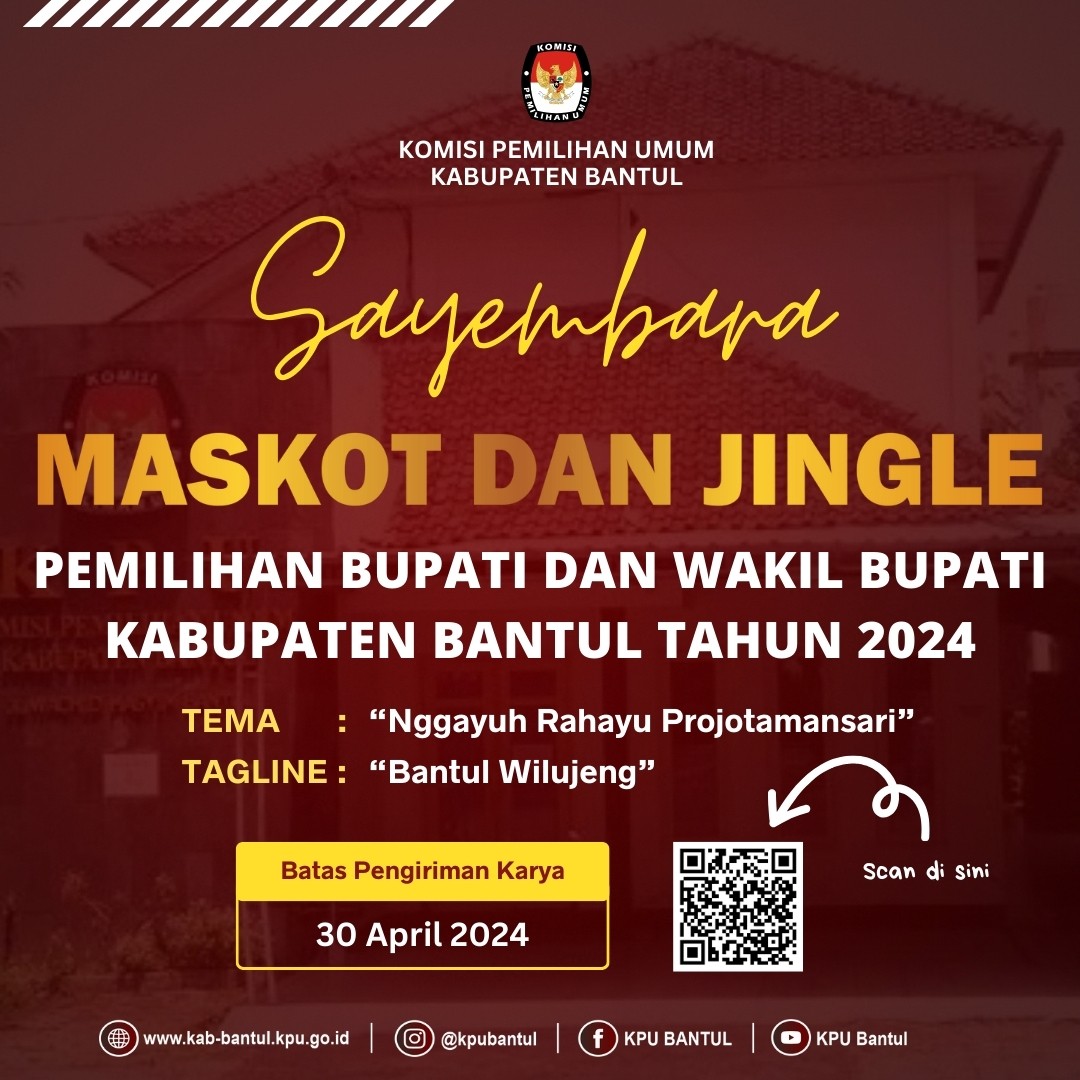 Dalam rangka menyukseskan Pemilihan Bupati dan Wakil Bupati Bantul tahun 2024, KPU Kabupaten bantul mengadakan sayembara desain maskot dan jingle Pemilihan Bupati dan Wakil Bupati Bantul Tahun 2024, untuk itu, kami membuka kesempatan kepada seluruh masyarakat untuk mengikuti sayembara ini. Ketentuan lengkap bisa dibaca di Sayembara Desain Maskot dan Jingle