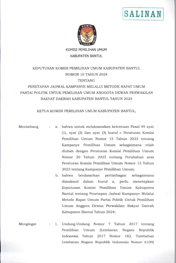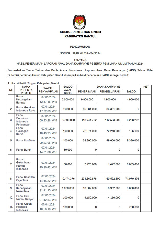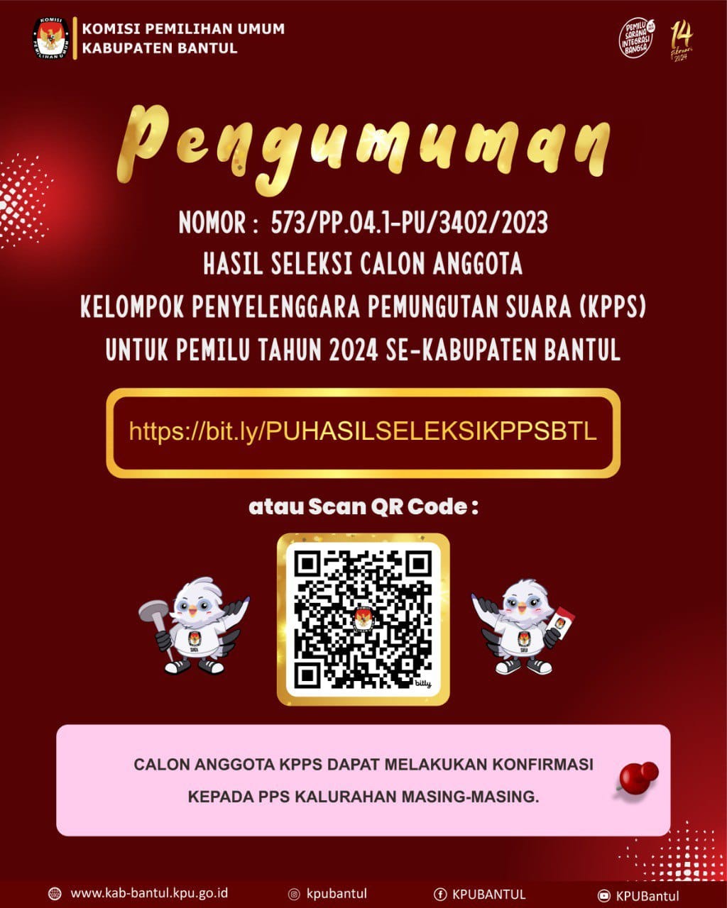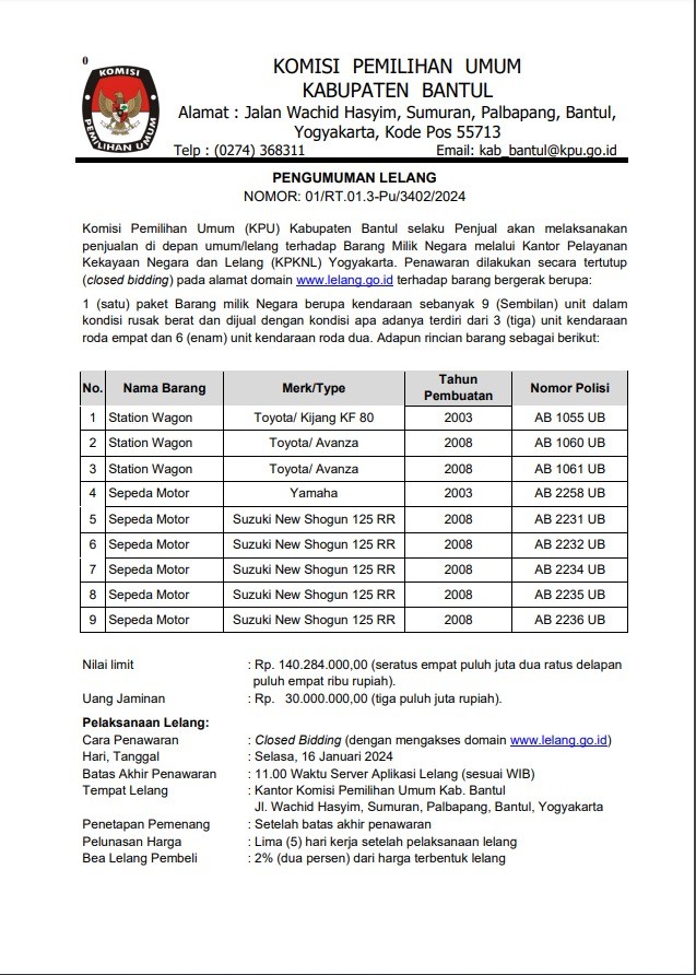 KPU Kabupaten Bantul menerbitkan pengumuman nomor 01/RT.01.3-Pu/3402/2024 yang menyatakan bahwa KPU Kabupaten Bantul selaku penjual melaksanakan penjualan di depan umum/lelang terhadap Barang milik Negara melalui Kantor Pelayanan Kekayaan Negara dan Lelang )KPKNL) Yogyakarta. Pengumuman selengkapnya bisa dilihat di Pengumuman Lelang
